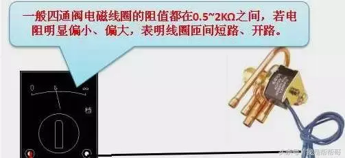 “测”:通常四通阀的电磁线圈供电电压都是交流220V电源,可以先测量线圈两端电压是否正常,再用万用表电磁线圈的阻值是否正常。