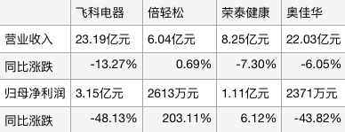 这令个护电器龙头飞科电器压力倍增,公司上半年业绩双降,净利润近乎腰斩。按摩电器方面,奥佳华与荣泰健康营收继续下滑,倍轻松微增。荣泰健康归母净利润表现不错,倍轻松扭亏为盈,奥佳华净利润下滑最多。