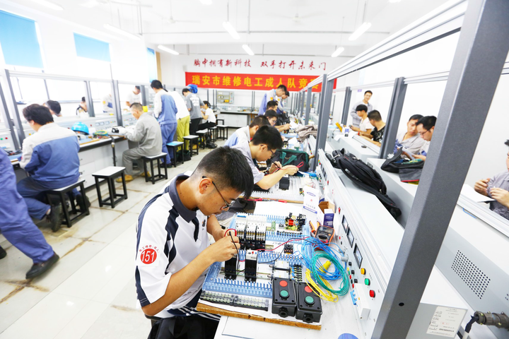 9月24日, 家电维修工选手在参加技能比赛。当天,瑞安市在职业中专学校举办家电维修工职业技能大赛,来自全市的制冷设备维修工、空调安装、家用电子产品维修工、维修电工等200多人参加了各工种的技能大赛,以展示家电维修工人风采,弘扬工匠精神,推动技术创新。比赛中获各工种第一名的选手,分别由 瑞安 市人社局、 瑞安 市总工会授予“ 瑞安 市技术能手”和“ 瑞安 市职业技能带头人”荣誉称号。同时,年龄在35周岁以下的第一名选手,将由团市委授予“市青年岗位能手”称号。