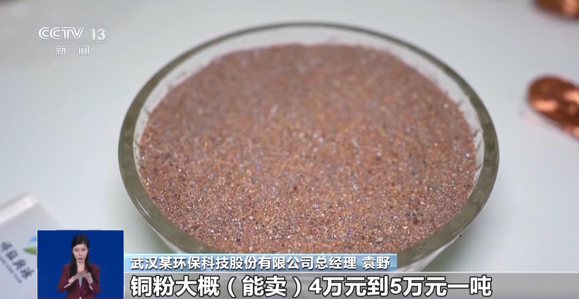武汉某环保科技股份有限公司总经理 袁野: 原来从家电上取下来的PCB板(电路板),(直接卖掉)大概在5000多元一吨,经过物理法研磨成粉以后,一般的铜含量在80%以上,铜粉大概(能卖)4万元到5万元一吨,另外树脂粉末也可以交由下游的企业处置,整体的经济效益提升了10%~20%左右。