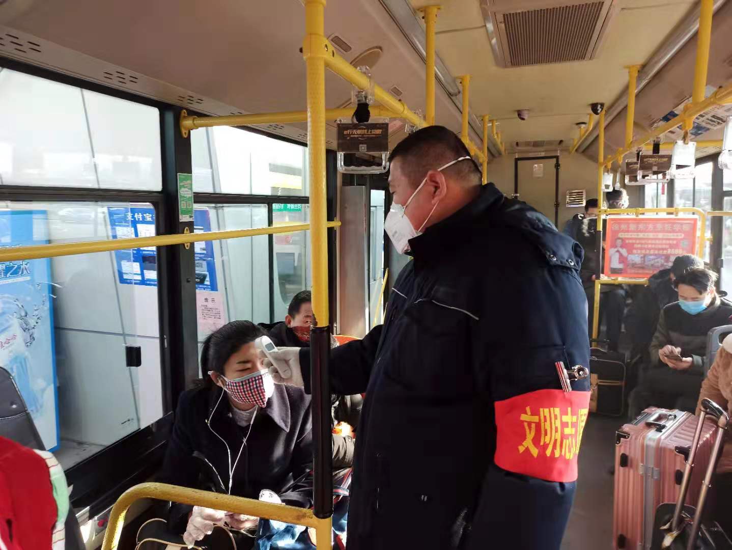 交汇点讯 “请上车乘客主动配合测温和消毒,保障自己和大家的安全。”年初六早上不到7点,徐州顺通巴士公司安全经理张伟严实佩戴口罩,手持体温枪逐一给上车的乘客检测体温,全神贯注投入工作。“我们作为每日早6点到凌晨12点的单程接驳班车,负责把从高铁站下车的旅客送至市内老火车站,每天服务乘客约5、6百人次。” 实际上,这是当前徐州市唯一运营的公交,为全力做好新型冠状病毒感染的肺炎疫情防控工作,徐州市区城市公共交通和汽车客运班车、包车运营自1月27日零时起全面暂停。 “现在疫情防控大局为重,出了高铁站还能坐上去市里的公交,真是便利又暖心!”家住市中心的张先生从事个体经营,上午从杭州回来后得知有巴士,便打电话通知家里人居家隔离,不必来接站。