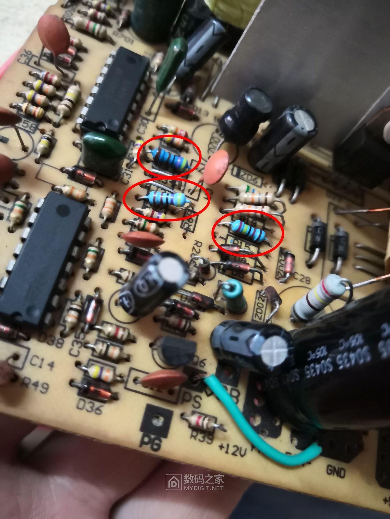 下面我具体的来说一下我的整个改造过程,我是先拿了一个山寨的电源来改的,这个电脑是我的第一台电脑上使用的,一直到现在都没有出过问题。按照帖子中的步骤来改(原帖在本文底部“了解更多” 里可以查看),因为没有24K跟12K五色环电阻,就用了两个相同比例的电阻来代替,具体阻值不太记得了,因为当时试了一下,没成功就丢到一边去了,按我的理解这两个电阻应该是起到串联分压的作用,应该用其它相等比例的阻值来代替也是可以的呀。