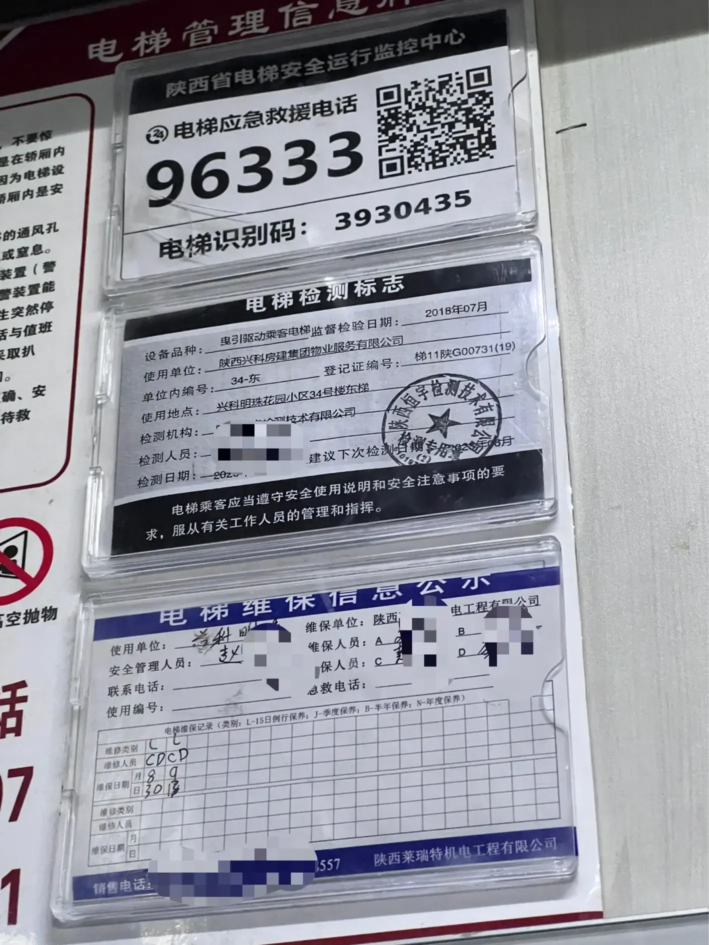 9月23日下午,华商报记者来到兴科明珠花园34号楼,两部电梯正在运行。记者进入电梯往返32楼,除了中途轿厢有稍微的抖动之外,整个运行过程还算正常。电梯右侧上方张贴“特种设备使用标志”和 “电梯维保信息公示”。使用单位为陕西兴科房建集团物业服务有限公司,检测机构为陕西恒宇检测技术有限公司,维保单位是陕西莱瑞特机电工程有限公司,陕西恒宇检测技术有限公司在使用标志上盖了章,下次检验时间为2025年8月。