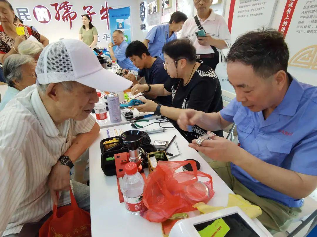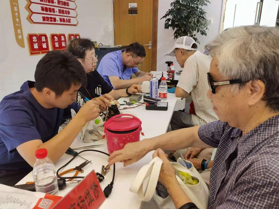 居民们带着电饭煲、电风扇、电水壶等小家电,有序排队。负责维修的工作人员仔细查看居民携带的小家电并进行维修。