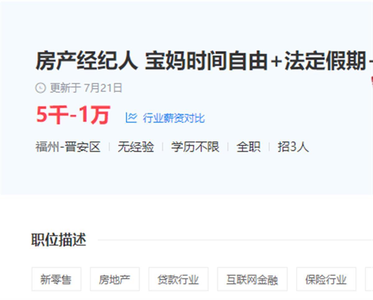 记者注意到,在一些房产经纪人招聘信息中,特别注明了“在家宝妈优先”“宝妈兼职也可”“适合宝妈时间自由”。