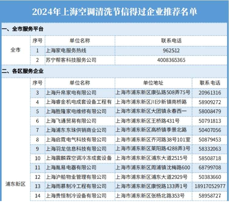 5月10日,“2024上海空调清洗节”启动首日,上海公布了本市第一批149家信得过空调清洗企业名单和2个全市性服务平台,向社会公布这些企业的区域和联系方式,供市民选择就近或合适的清洗企业服务。详细名单见文末。