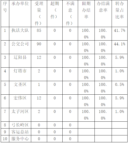 7月份,执法队投诉举报案件85件,增加13件;公交公司投诉举报案件90件,增加22件;灯塔市交通运输局投诉举报案件2件,增加0件;文圣区交通运输局投诉举报案件1件,增加0件;宏伟区交通运输局投诉举报案件12件,增加8件;辽阳县交通运输局投诉举报案件12件,增加9件;太子河区交通运输局投诉举报案件2件,增加2件;弓长岭区交通运输局、交通事务服务中心、长途客运总站有限公司投诉举报业务数量为0。