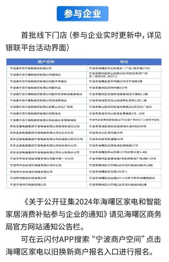 “此次以旧换新活动以‘实实在在为群众发福利’为出发点,汇集了很多商户,补贴金额以及力度都非常大,我们也发布了通知,公开征集更多企业参与到此次以旧换新消费补贴中。”海曙区商务局相关负责人介绍。