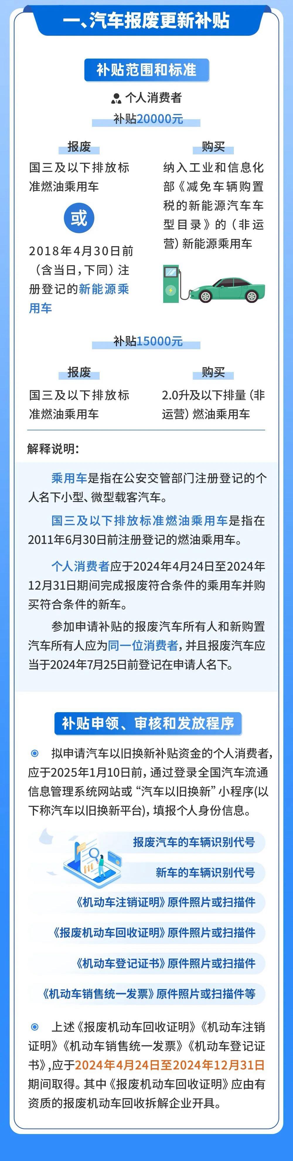 记者了解到,本次汽车以旧换新的补贴也进一步加码,个人消费者汽车报废更新补贴最高可享20000元,汽车置换更新补贴最高可享12000元。