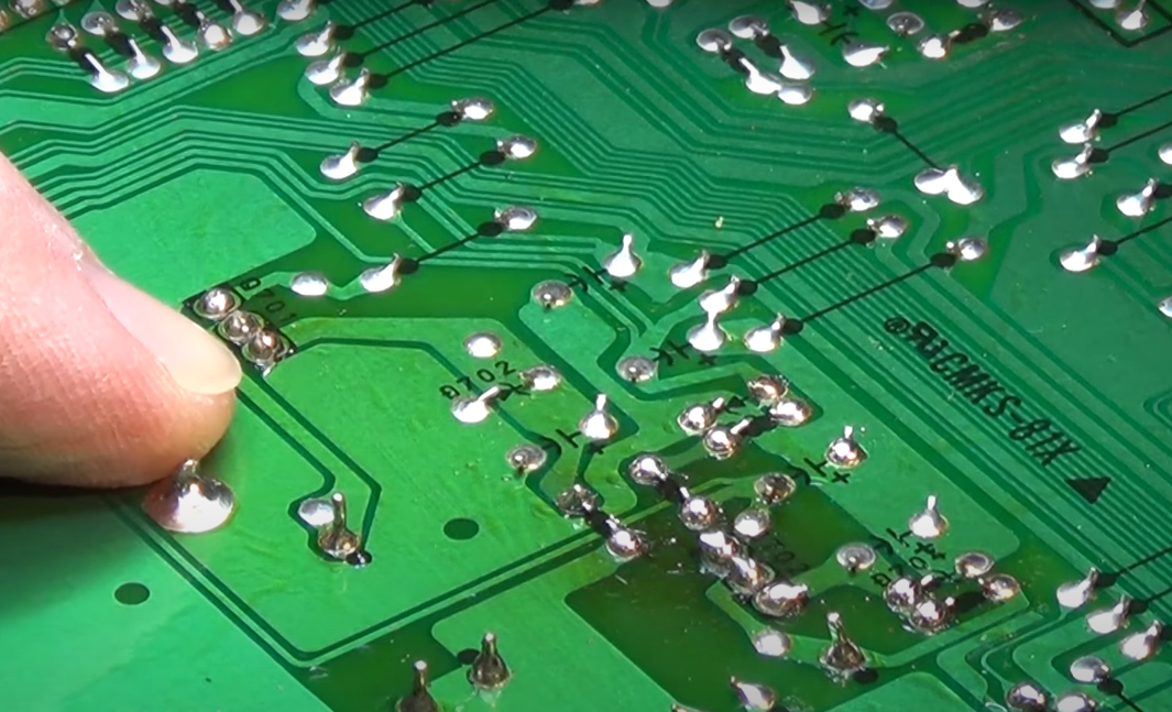 翻过机器,将前面板地线用螺丝牢牢拧在散热片和钢板上。然后开机故障依旧,遂决定对虚焊点进行补焊。
