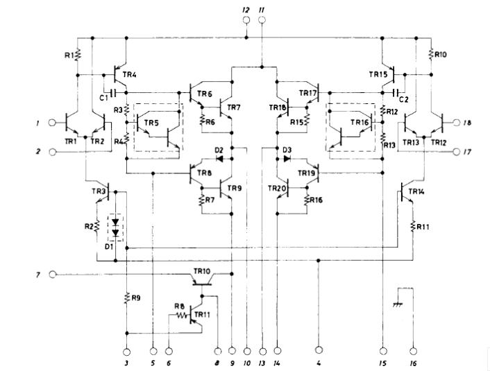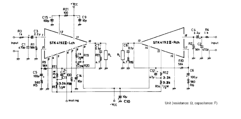 上图是其内部原理图,和原厂推荐线路图。其可提供50W*2的不失真功率。在YAMAHA,SONY,PIONNER等一些日产低端机上用量较大,其线路简洁,制作容易,音质良好。故障率也很低。
