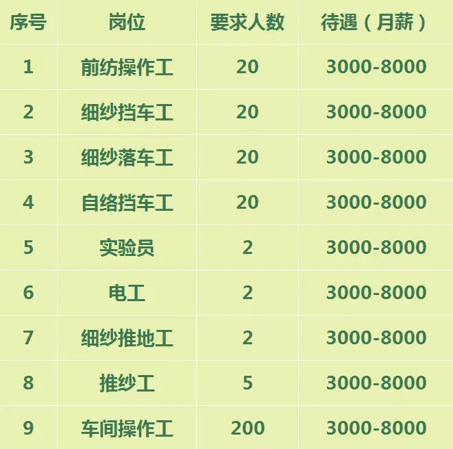 9.宁陵驰野纺织:招工56人。前纱操作工,推纱工,电工。年龄:18-55岁。工资3000元-6000元。