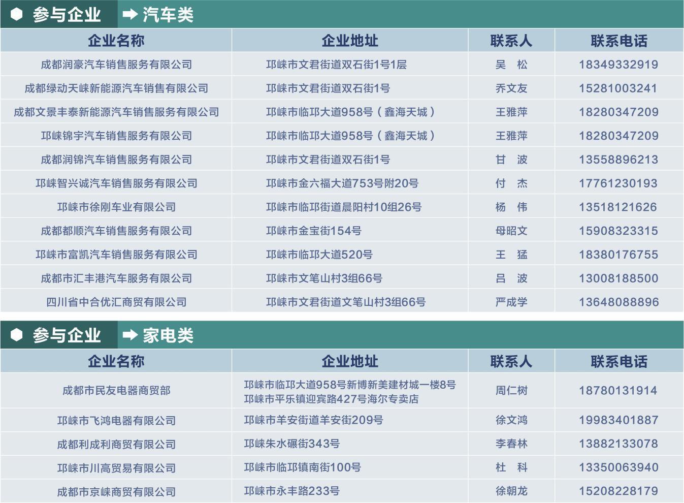 汽车焕能方面 ,在国家和成都市汽车以旧换新政策基础上,推出燃油车和新能源车最高奖励8000元等优惠;家电焕智方面 ,在成都市“绿色家电·智享成都”促消费活动基础上,联动大型家电企业通过现金奖励等方式,对在邛崃市购买电视机、投影机、电冰箱、洗衣机、空调等的消费者,最高补贴800元;厨卫焕新方面 ,鼓励消费者进行安全智能产品迭代升级,对在邛崃市购买热水器、吸油烟机、燃气灶具的消费者最高补贴900元。