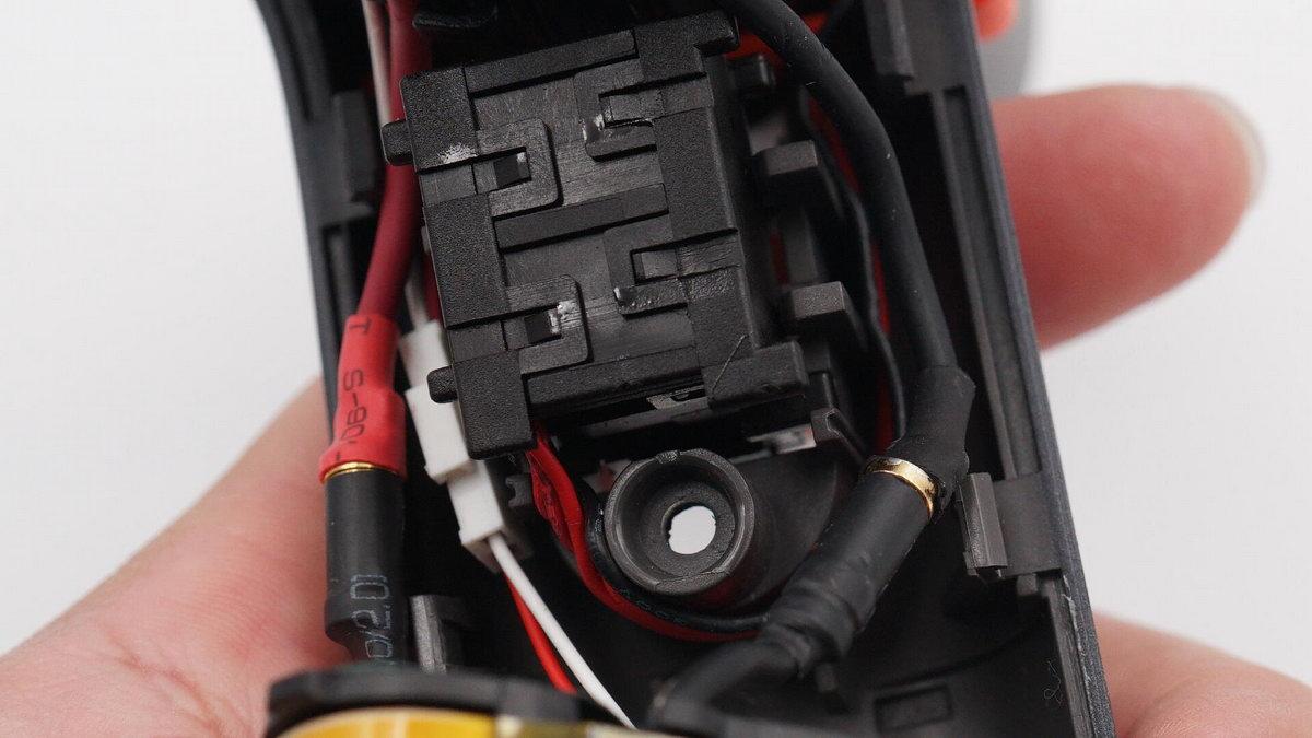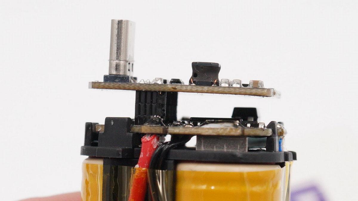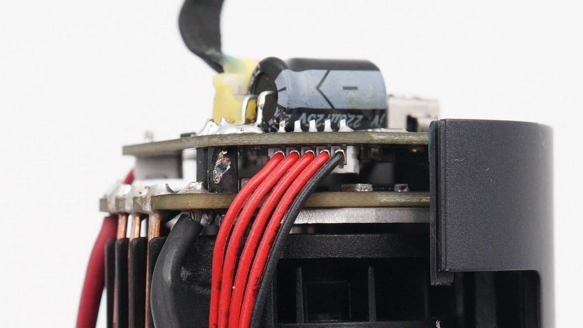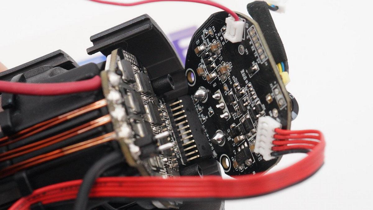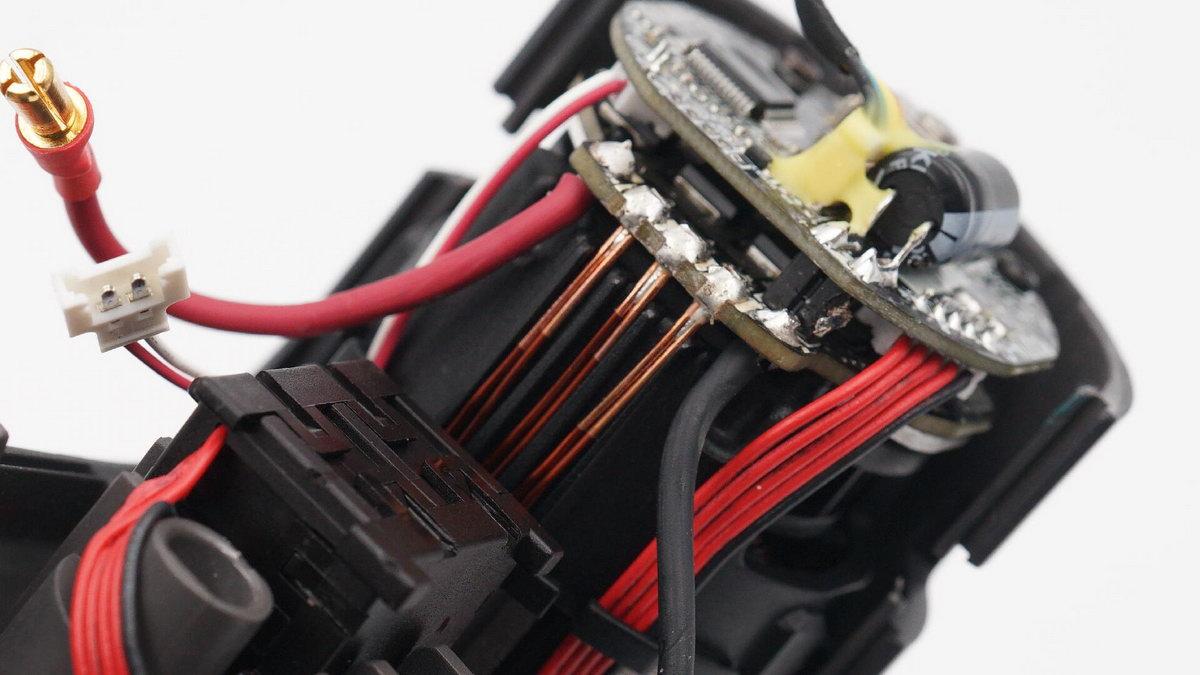 最后便可以将主体外壳拆开,可以看到内部由电池组、无刷马达和几块小板组成,通过导线连接通电。