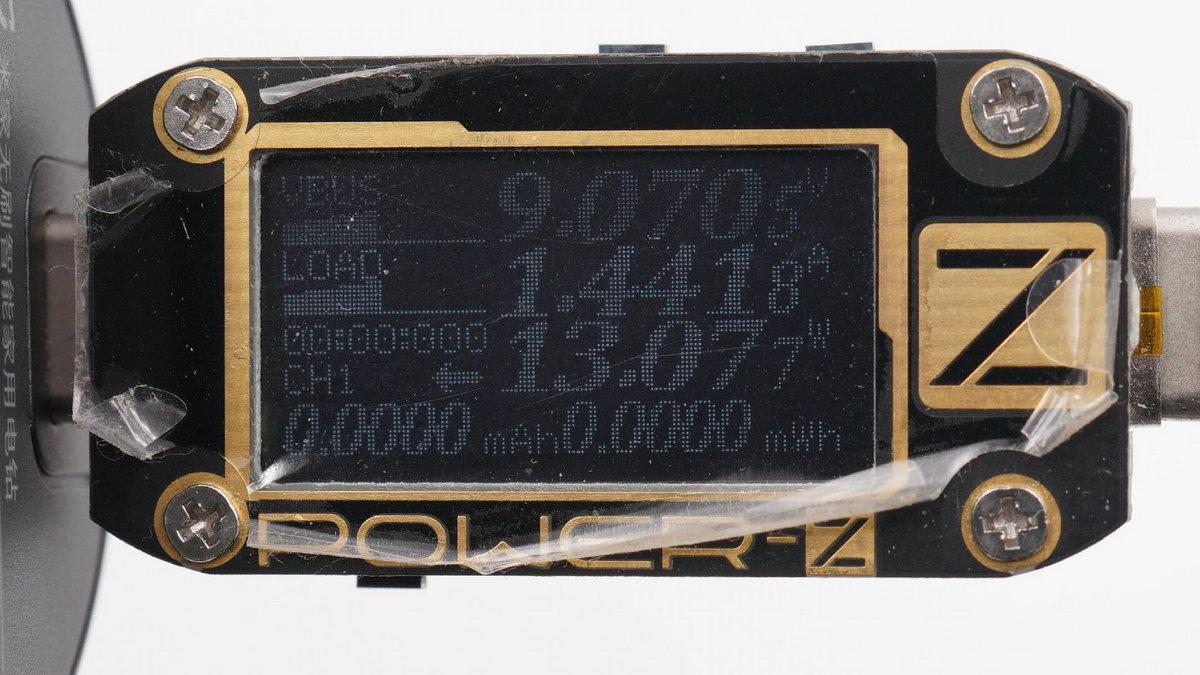 使用配套的充电器给电钻充电,使用ChargerLAB POWER-Z KM001C测得充电功率为9V 1.44A 13W。