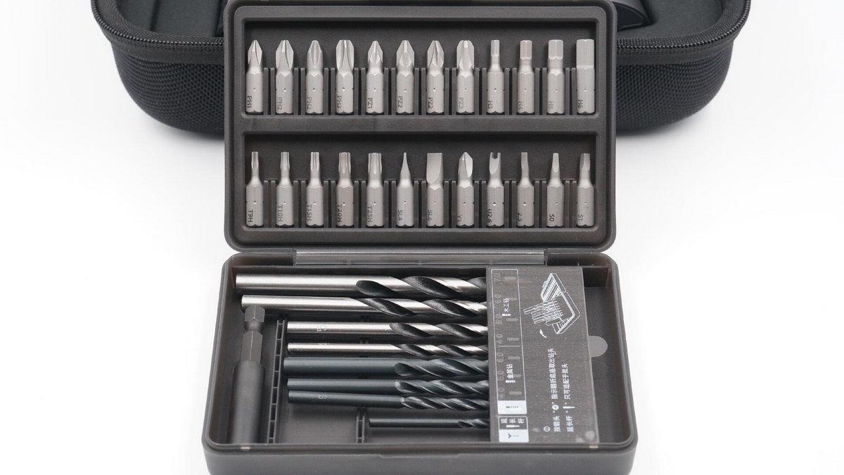 批头盒内东西一览,包括延长杆、24个批头和8个钻头。