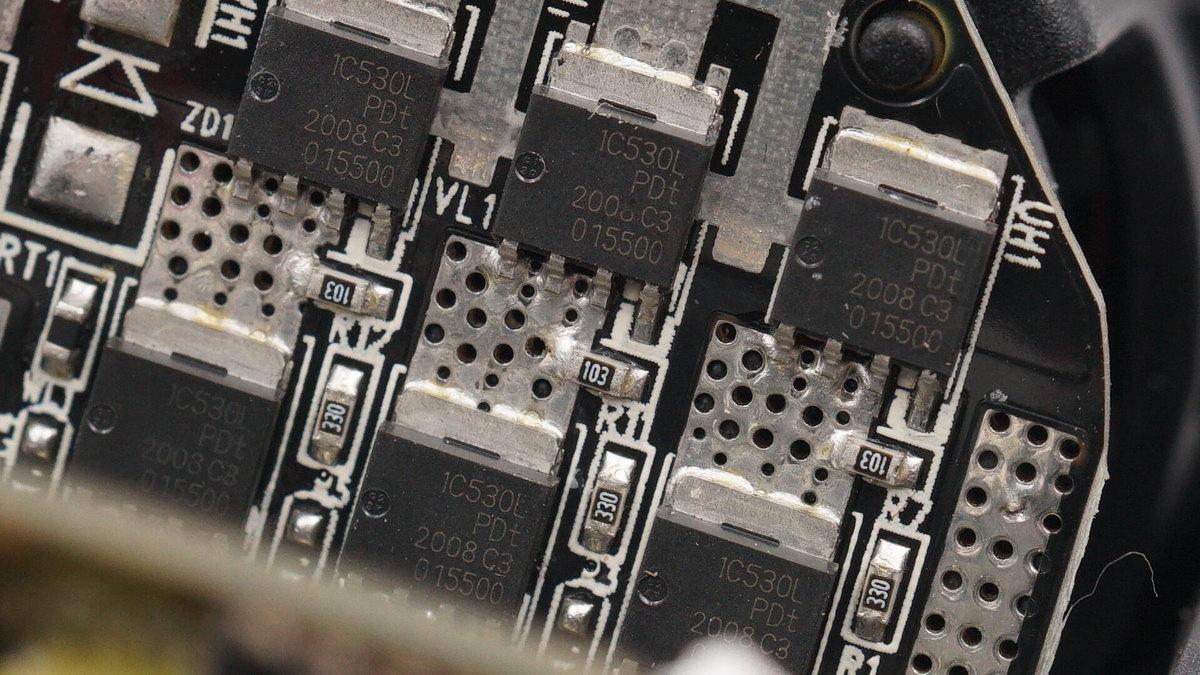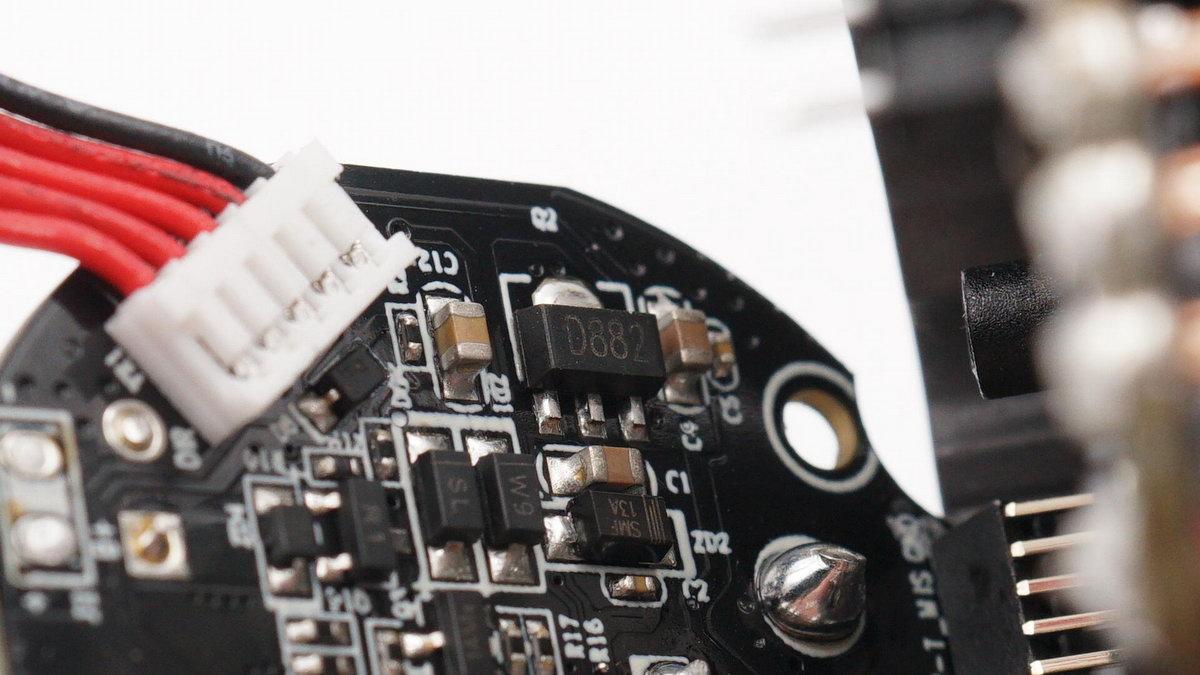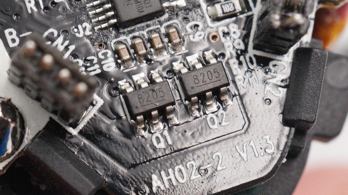 下层小板设有六颗相同的MOS管,组成无刷驱动。右侧R001电阻用于过流保护。