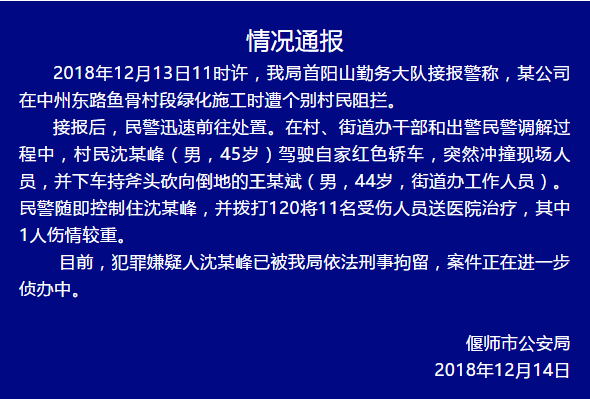 河南偃师一村民驾车冲撞并砍伤街道办副主任 11人受伤