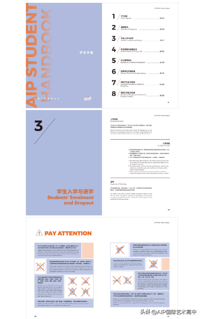 在AIP 这个家庭中,老师们为你精心准备了《新生入学手册》 (学生手册及新生入学手册将统一电子邮件发给已缴纳学费的2023新生,详见邮箱附件),向各位介绍学校的概况及入学相关事宜。请仔细阅读手册的内容,并严格遵守相关规定。