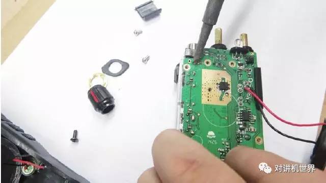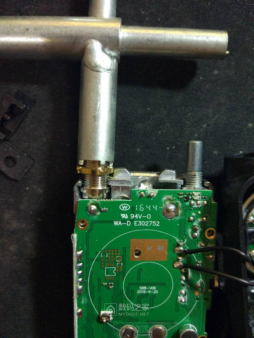 天线座上的螺丝有704胶,直接拧不下来,还是上专用工具好使。拆下四颗小螺丝并拧松天线座螺母后,电烙铁烫开音量旋钮附近的正极大焊点,电路板就可以取下来了。