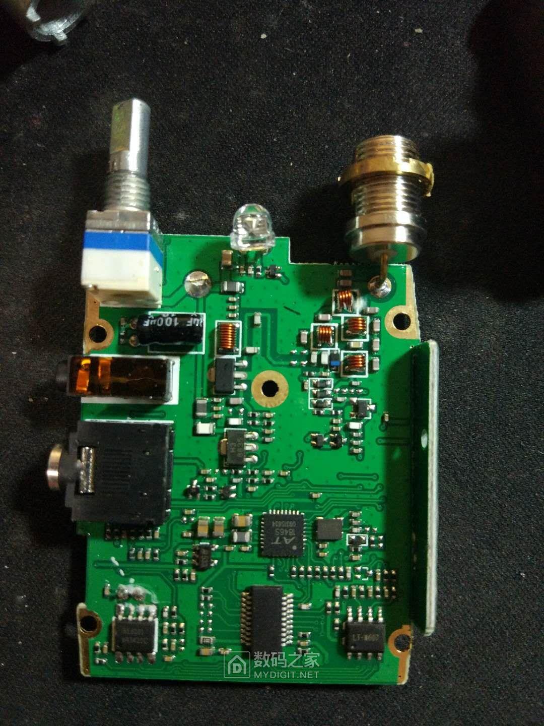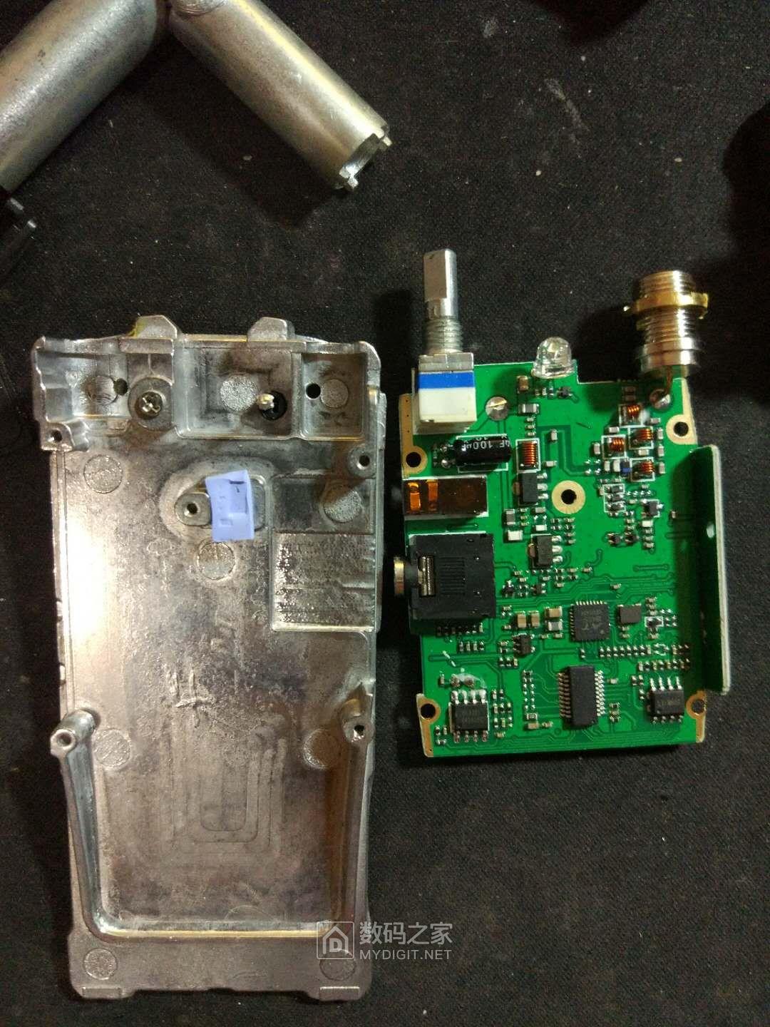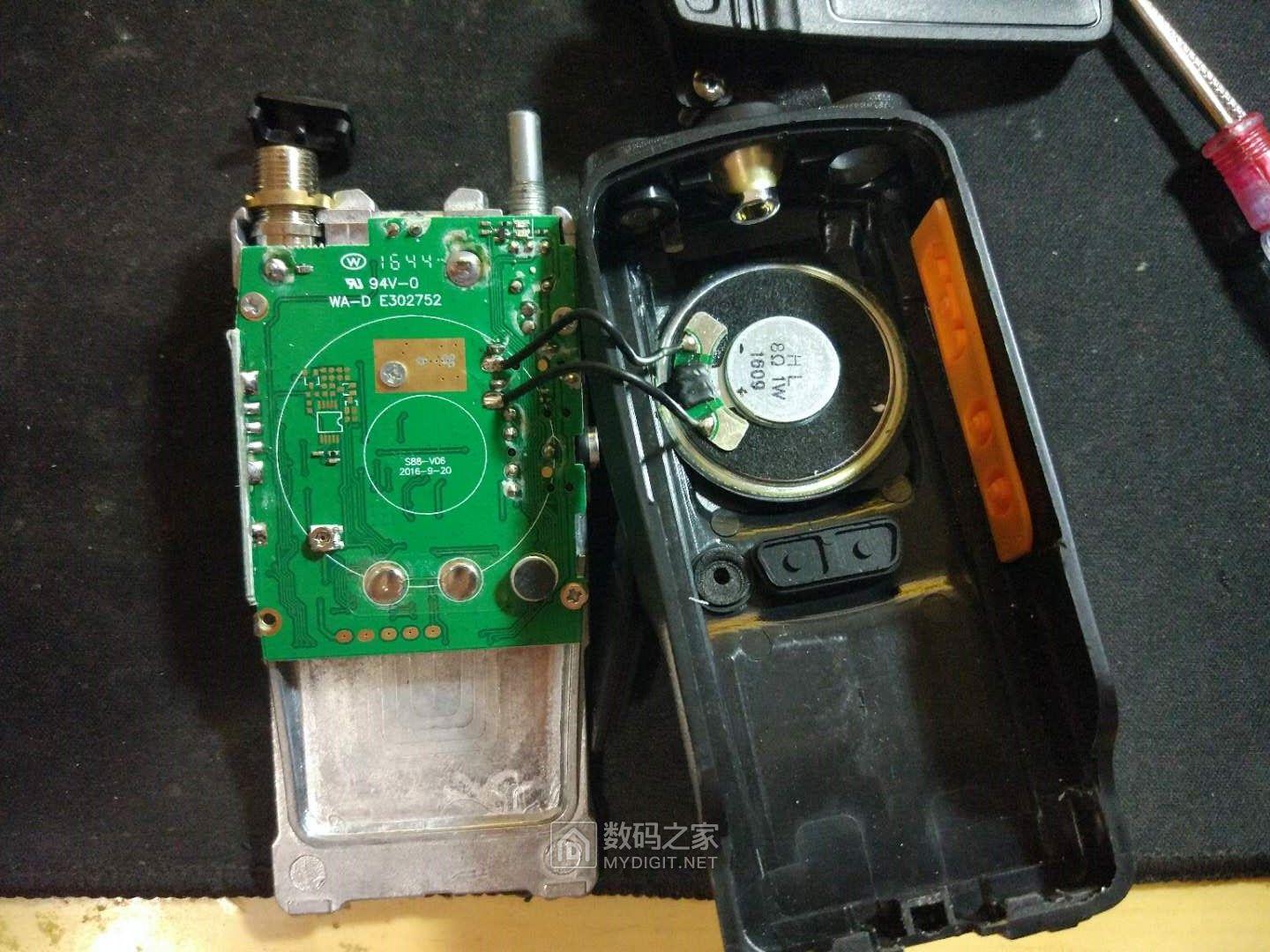 这是刚拆开的样子。拆的时候卸下背夹,拿下背夹螺丝处盖板,然后拔下音量旋钮,拧下音量旋钮内的螺母,然后拿一字改锥撬对讲机底部铝板附近,注意胆大心细,壳子比较紧,耳机插座那可能会卡住,与前壳分离后不要大力往下拽,以免把喇叭线拽断。