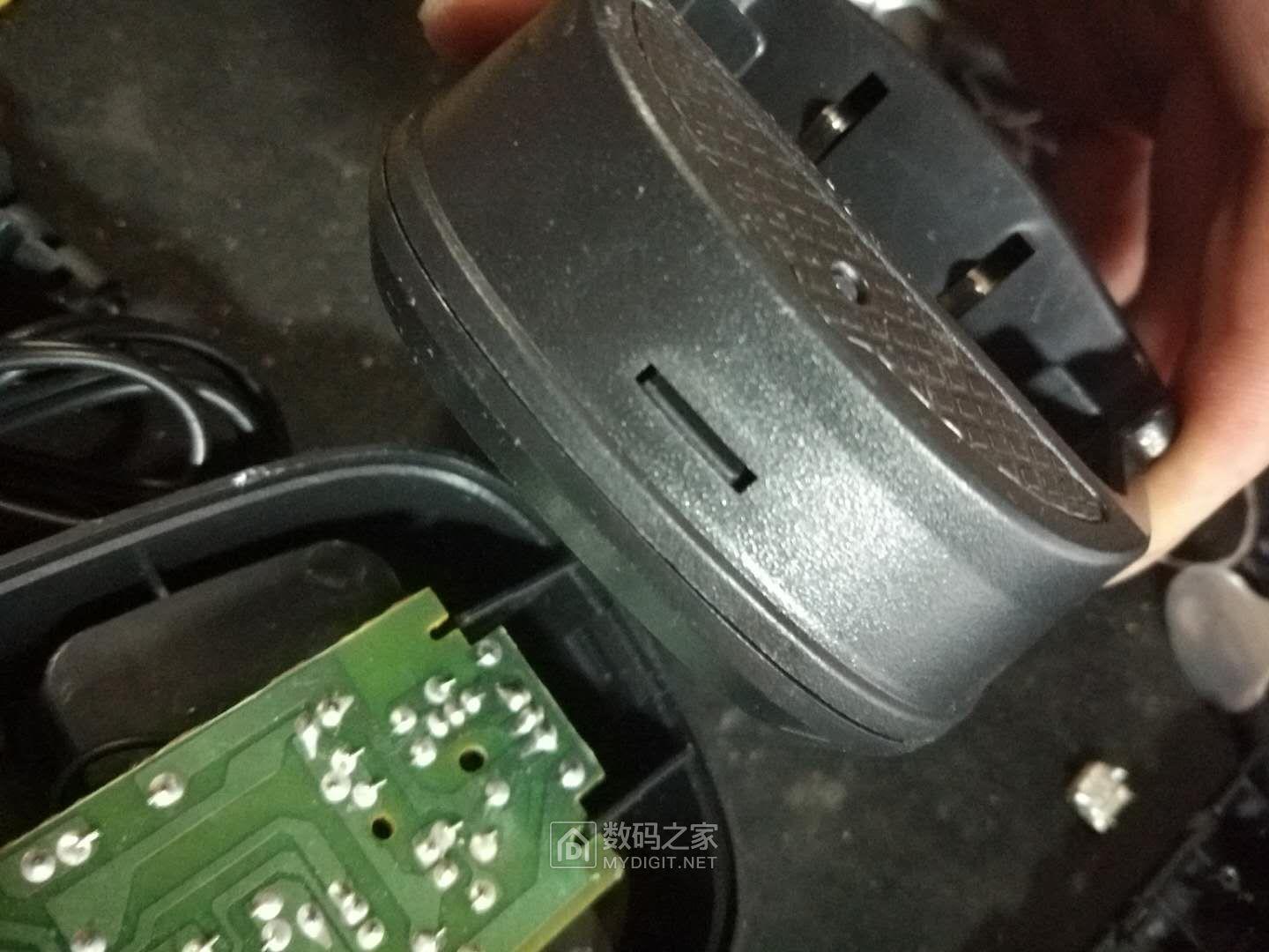 这是充电器拆开。注意解开螺丝撬的时候小心点,图上一横条这地方有卡口,最好在电源进线处撬。