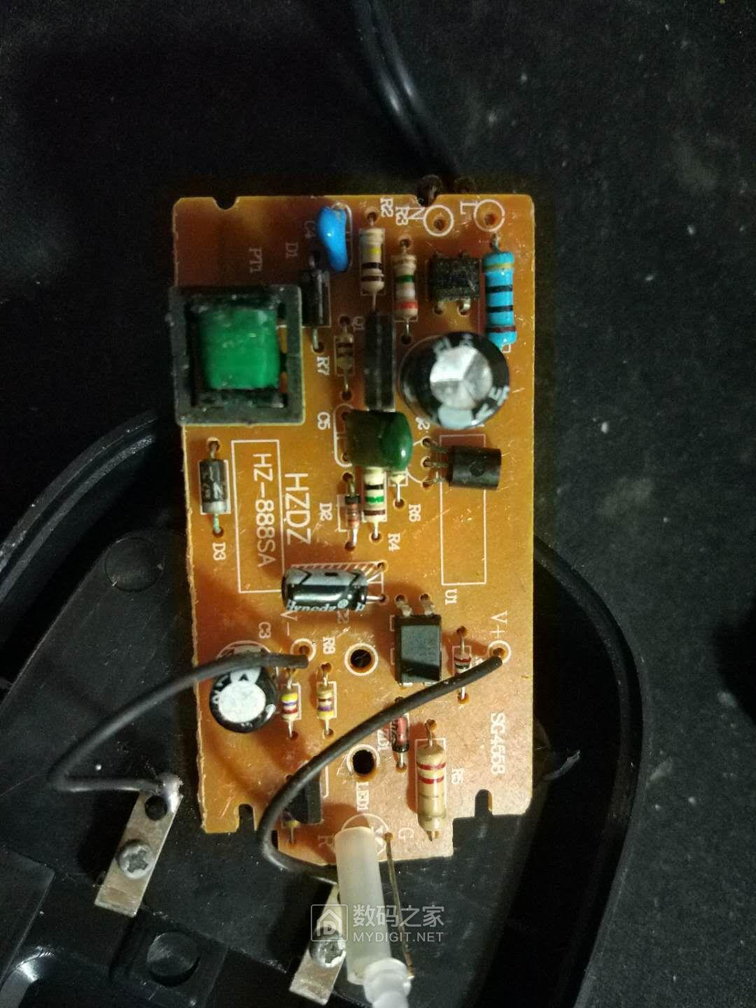 充电器正面,13003的功率管,稳压管+光耦稳压。电路结构和山寨手电山寨手机充电器完全一致。充电保护全靠电池内部保护板了,建议充电时多看着点,充满绿灯后赶紧拔下来,否则电池过充。