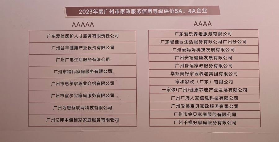 综合广州市家政服务综合平台2022年11月-2023年10月企业年度评分,现场还公布了2023年度广州市家政服务综合平台信用等级4A、5A家政企业。