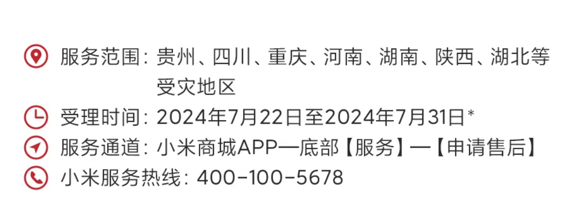 IT之家 7 月 22 日消息,小米服务今日宣布,对连续强降雨洪涝区域受损的小米 / 米家品牌 空调 / 冰箱 / 洗衣机产品,免费提供检测、维修服务 (经工程师检验属于可修复的家电产品,可享受免费维修服务)。
