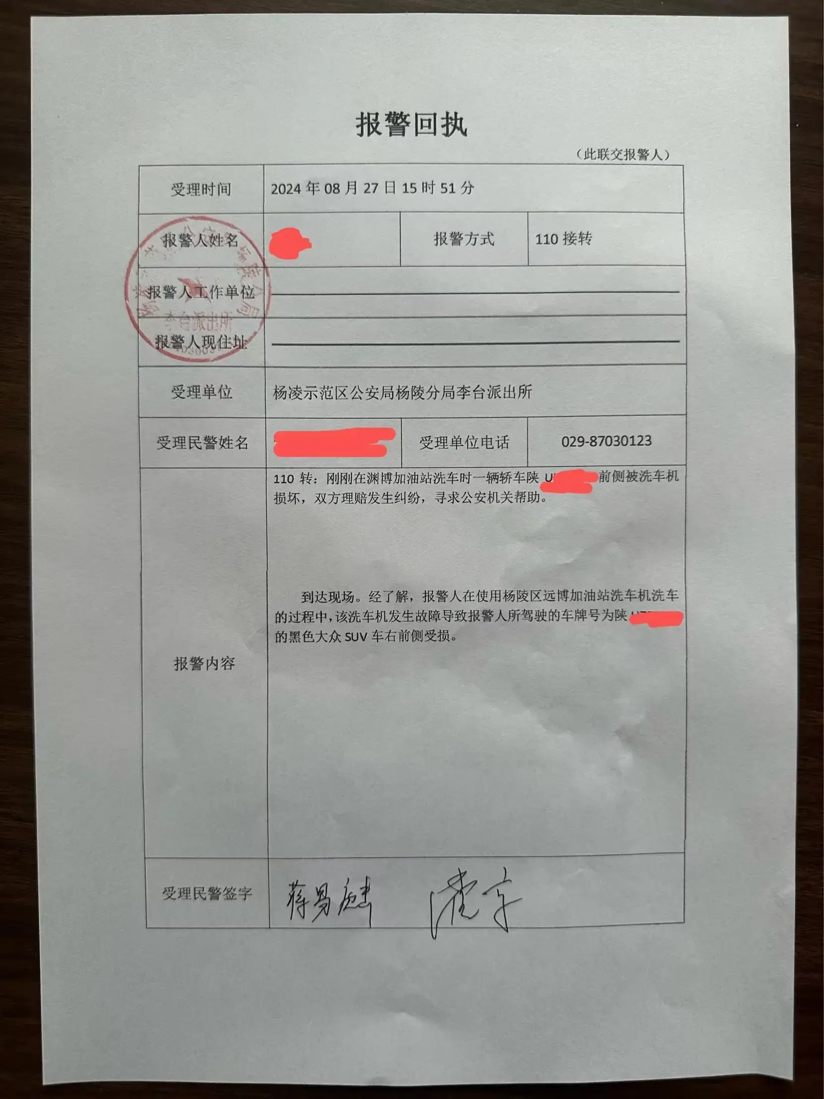 随后李先生选择报警处理,警方到场处理后出具了报警回执,回执显示:“经了解,报警人在使用杨凌远博加油站洗车机洗车的过程中,该洗车机发生故障导致报警人所驾驶的黑色大众SUV车右前侧受损。”