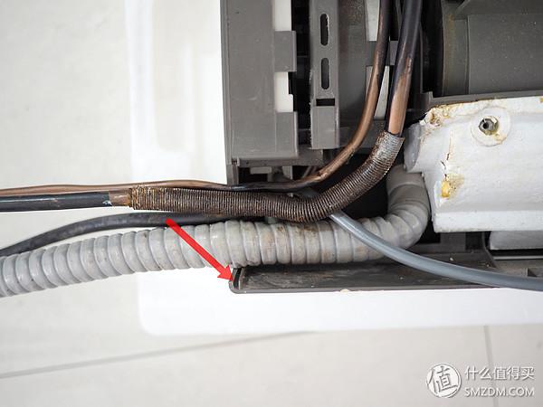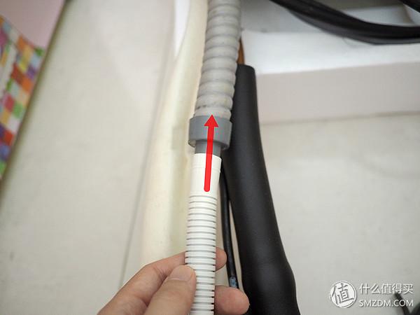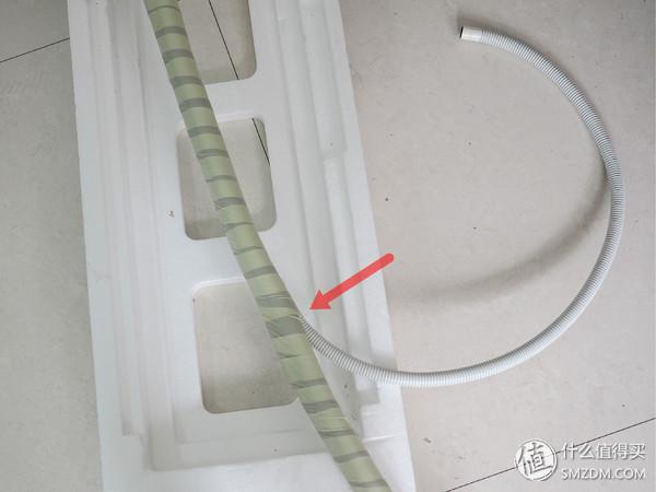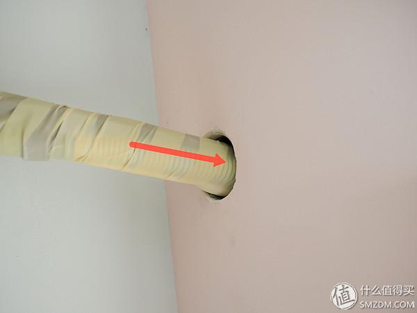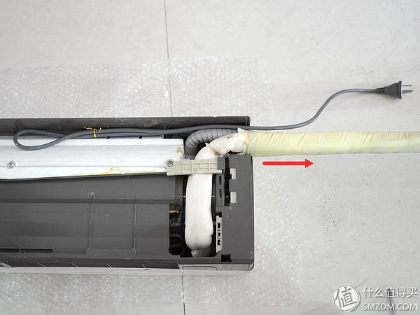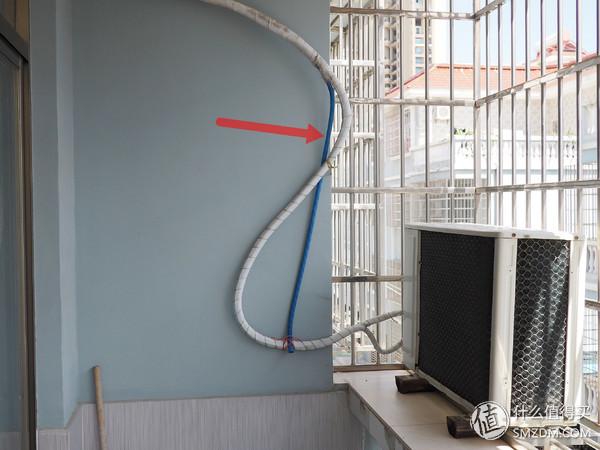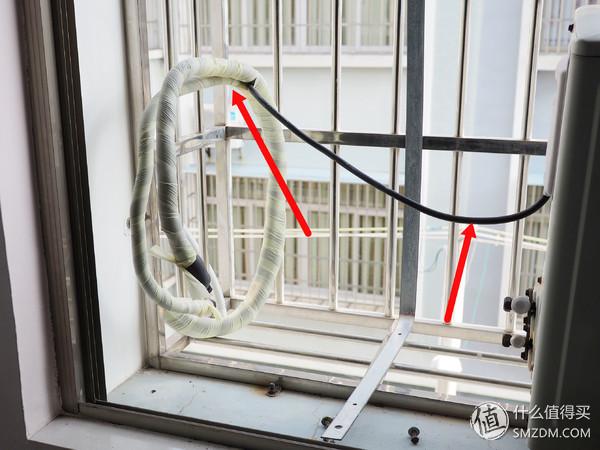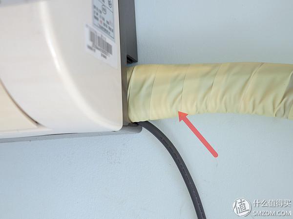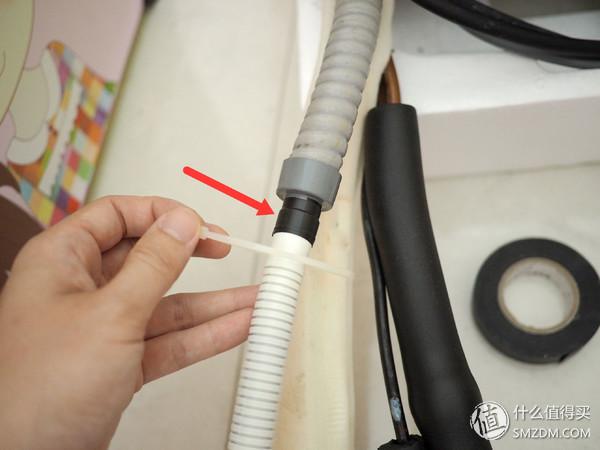 ▲按箭头方向把室外机电源线、铜管和排水管用扎带缠起来,我用了一次性扎带辅助固定。注意排水管的位置要在靠近地面一侧。