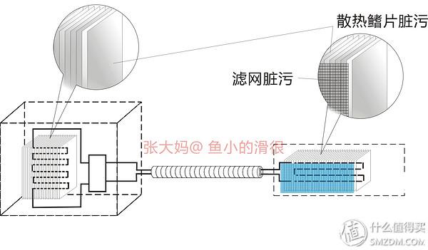 ▲内、外机在长期使用后,散热鳍片、滤网都会有灰尘、污垢堆积,影响热交换效率,特别是外机散热鳍片,很多人会忽视,由于暴露在室外,沙尘严重的地区尤其严重。内机的散热鳍片位于室内,还有滤网的过滤,因此脏污情况一般相对外机没有那么严重。但是若滤网堵塞,流经内机散热鳍片的风量就会大大减少,热交换也将无法有效的进行。因此内、外机散热鳍片、内机滤网都需要进行清洁保养。