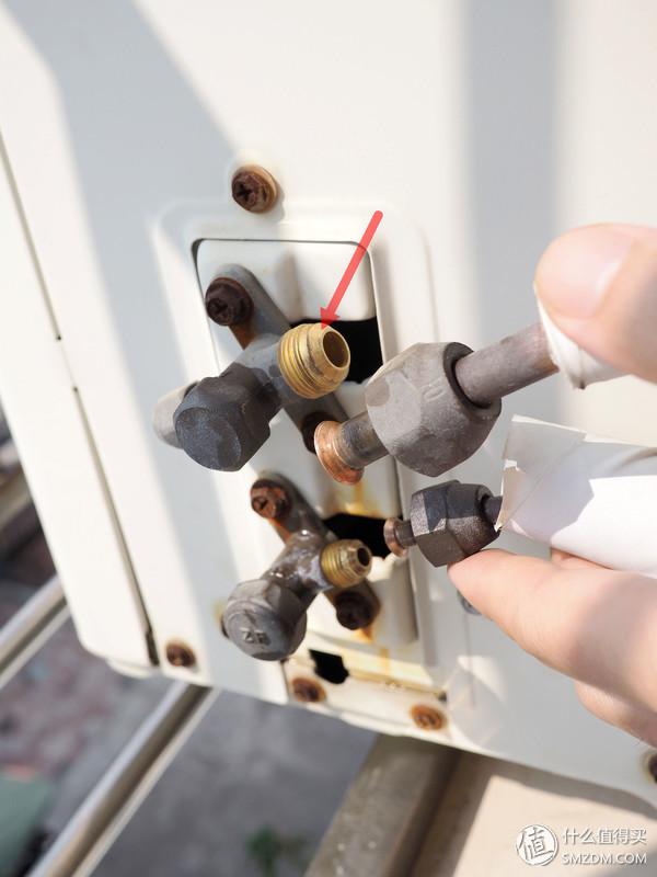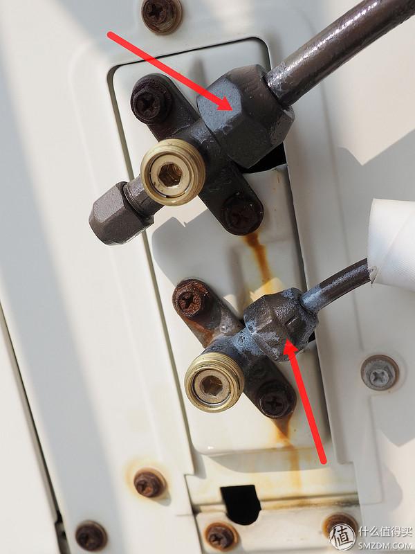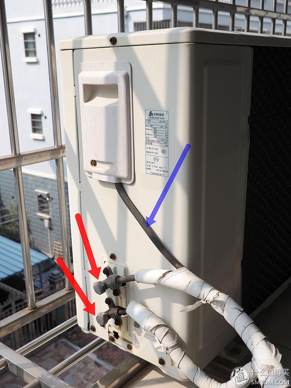▲要进行移机或者深度保养的话,须先拆下室外机的电源线(蓝色箭头)、两根连接铜管(红色箭头)。在拆下铜管前,我撅腚把管内的制冷剂收纳进外机之中封闭起来,再次安装时重复使用,节约费用。