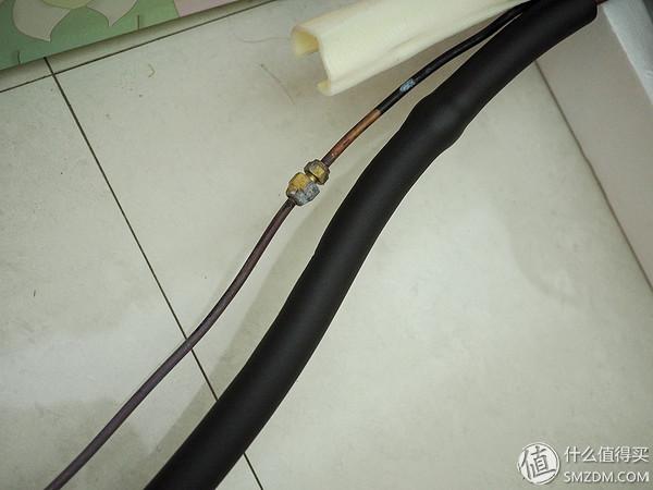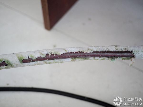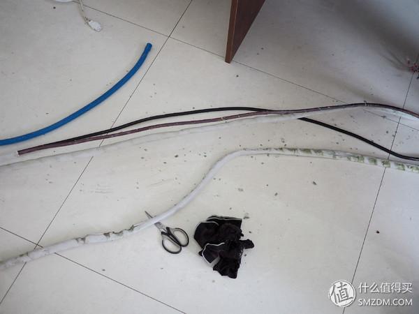 从外部看使用了8年的空调铜管隔热保障材料似乎没有问题,但是用剪刀辅助拆下外缠绕扎带后: