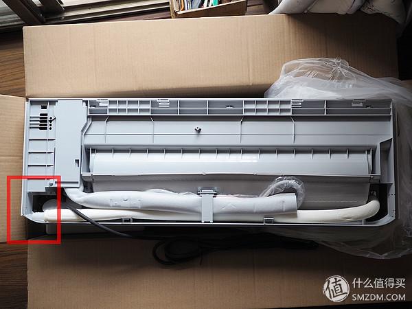 ▲另外这个位置还有一个小细节。就是小米的这个室内机管线出口是一次性的,开模时和室内机外壳一体开出,这也是现在很多品牌空调的常规做法。这样的缺点是首次安装时需要用刀切下,但是在移机更换管线走向的话不能再封上了。