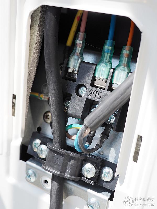 ▲室外机连接电线盖板、背面有接线说明及黑色隔音棉条、接线完成后的样式。