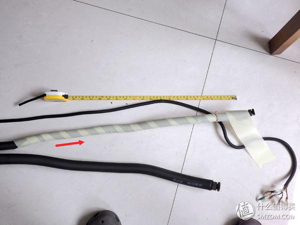▲接着开始缠绕外扎带。先把和外机接口一侧的分叉段选其中一根铜管缠好,可根据自己需要确定的分叉段的长度,我大约预留50cm分叉,扎带多缠10cm,总共缠了大约60cm,按箭头方向缠。