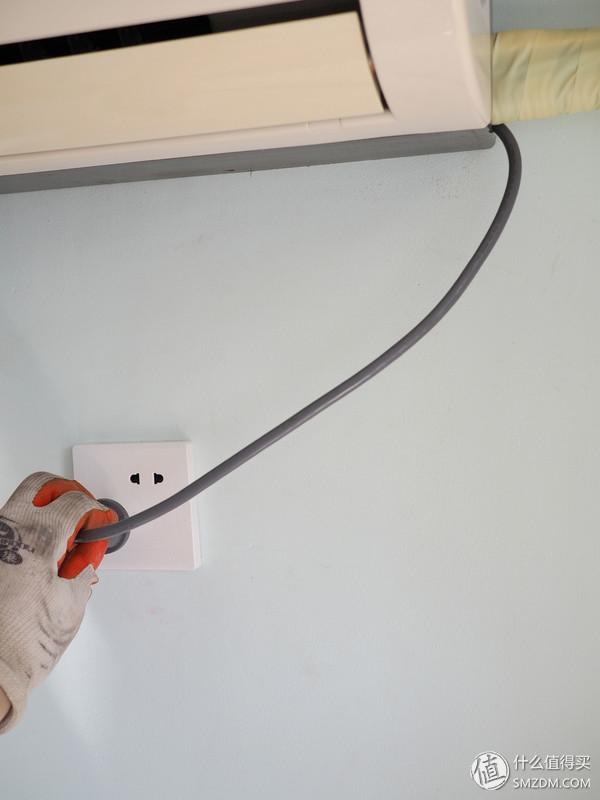 ▲将所有管线从墙洞中穿到室外,并将室内机固定到挂墙固定卡板上。根据墙壁插座的距离调整好电源线的长度,保证美观。