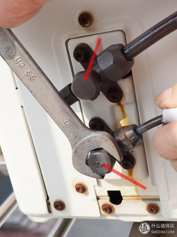 ▲首先用19号的开口扳手拧下这2个螺帽,螺帽内的是外机和铜管连接的阀门开关。运行空调,调到制冷模式,将温度调到最低,确保压缩机处在工作状态,大约等10分钟。