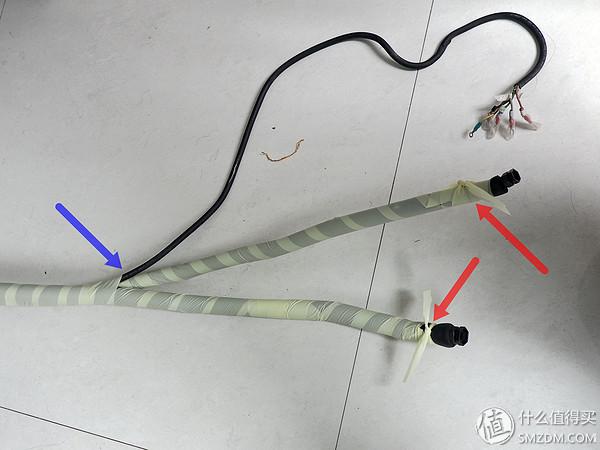 ▲在分叉处把室外机电源线分出来(蓝色箭头),缠到铜管末端后,用剪刀把扎带剪出一个分叉并包扎稳妥(红色箭头)