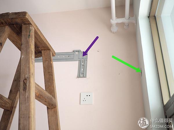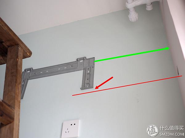 ▲用十字螺丝刀拆下挂墙固定卡板,安装在预留好墙洞的墙壁一侧,安装需要使用电钻、膨胀钉,安装时注意挂墙固定卡板和墙洞的上下距离(红色箭头),空调排水管要稍微高出墙洞一些,方便排水。以及挂墙固定卡板的水平,歪了会排水不畅、为了美观还需注意卡板侧面到墙洞的距离(绿色箭头)。