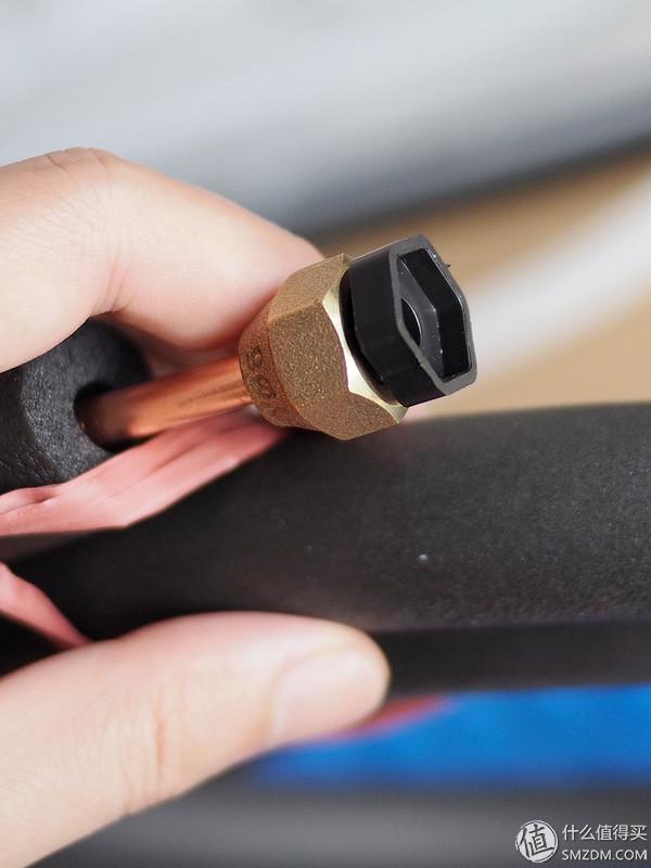 ▲把新的橡塑保温棉套入铜管中,用剪刀剪掉多余部分。