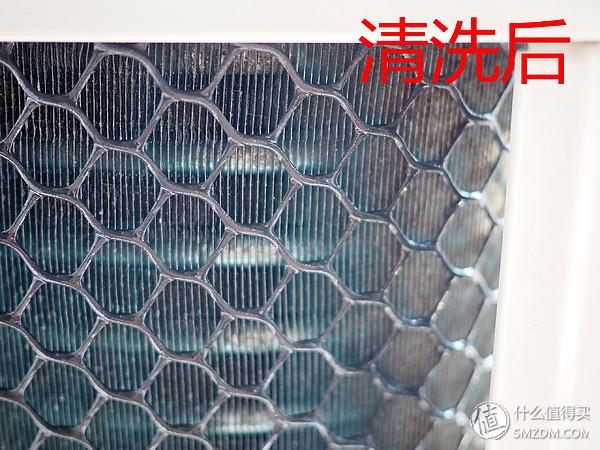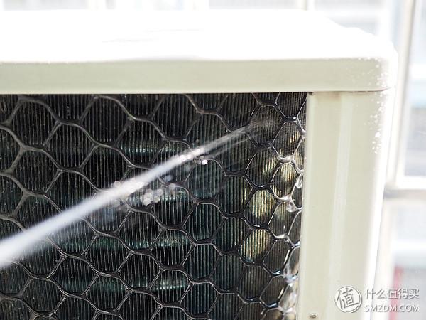 ▲室内机的滤网散热鳍片因为有滤网保护,所以表面并不是很脏(裆燃前提是要定期对滤网进行清洗)。如果比较脏的话,就将空调清洁剂均匀喷到散热鳍片表面,待几分钟清洁剂泡沫消失并化成水从排水口流到室外后,就可以滤网完成清洁了,非常方便,懒人也可以无忧操作。