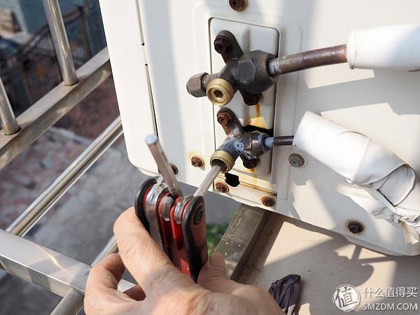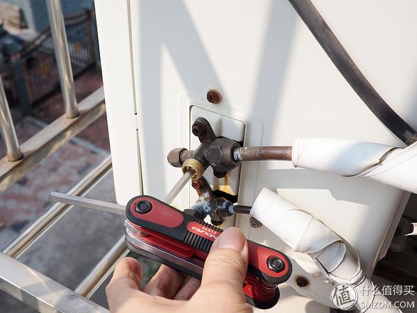▲等待大约1分钟,或者听见压缩机的声音有明显的变化时,用内六角扳手将粗的这根铜管端阀门开关顺时针拧紧,马上关闭空调,此时制冷剂就回收到外机中了。