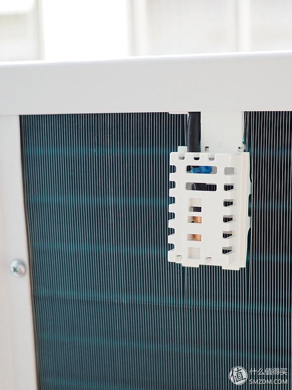 ▲室外机的散热鳍片间距比我那台1匹的要小很多。并且设置有温度传感器,我猜应该是用于传回电脑控制外机风扇转速的,定频的空调没有该设备。
