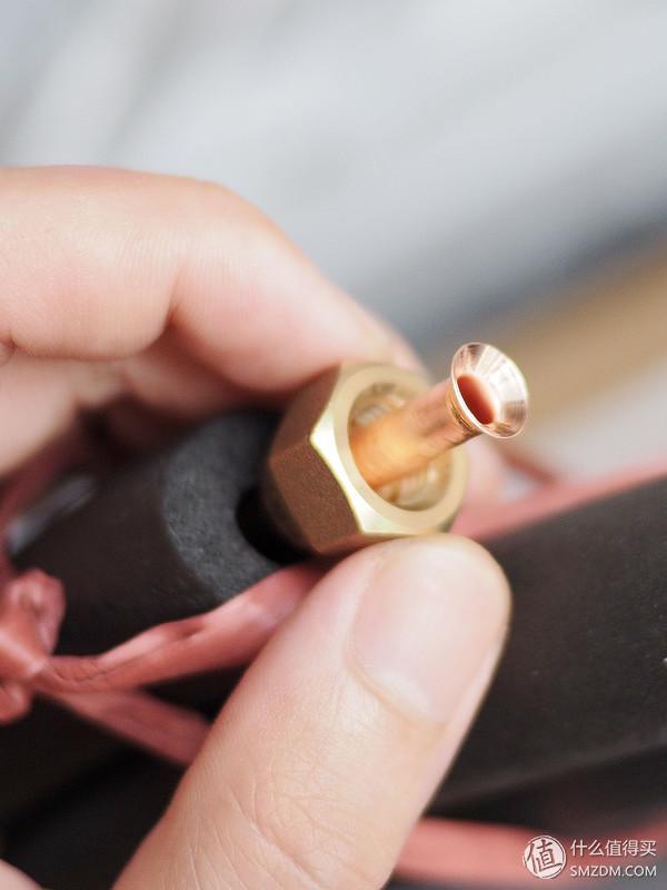 ▲喇叭口的铜管和接头这边的截面(红色箭头)拆装时要注意小心保护,防止平面受损漏气。