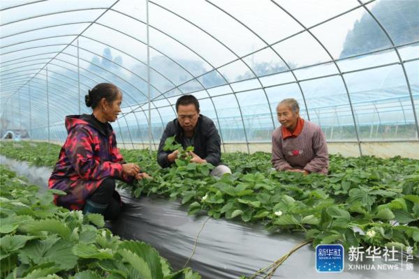 凯里市下司镇马场村草莓基地,高级农艺师徐庆军(中)正在为种植户讲解草莓的病虫害防治。新华社记者蒋成 摄