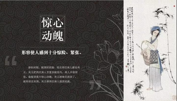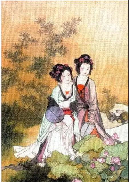 上图所画的是一起被送入吴国后宫的西施和郑旦,在历史上的那一天,当吴王夫差将她们俩安置在椒房殿内的时候,美人并肩而坐,此情此景,便只能用“惊心动魄”来形容了。