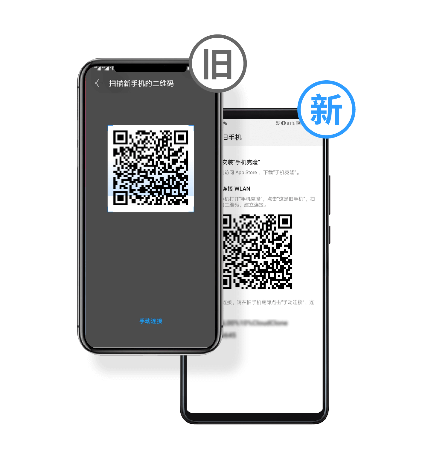 2. 用旧手机扫描新手机上的二维码,建立连接。还可以选择手动连接:旧手机在设置>无线局域网中,连接新手机本地热点,建立连接。