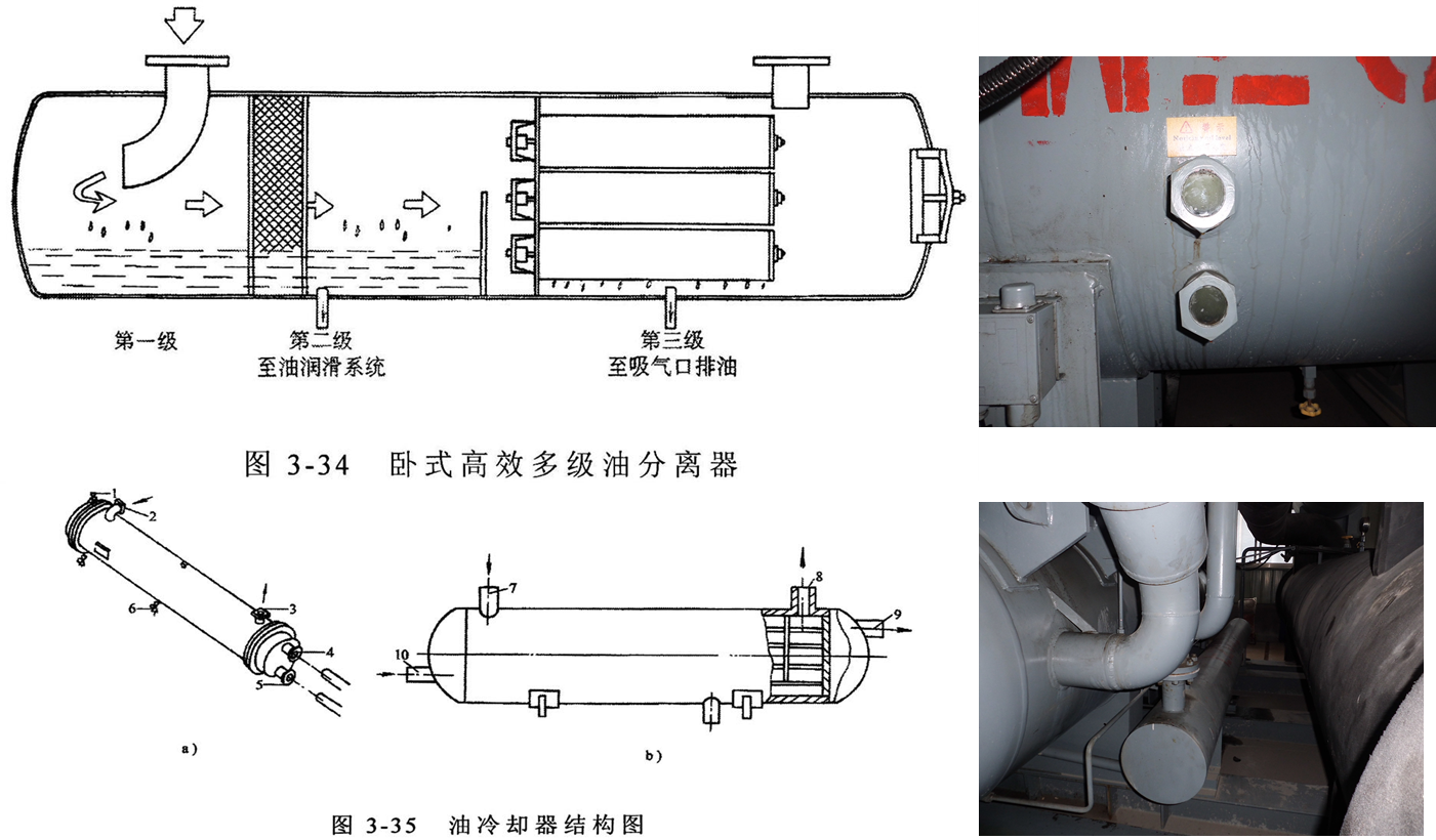 此外在螺杆式冷冻机中也多采用二级油分离器,二级油分离器分离出的润滑油可利用吸、排气压差不经油泵直接被压送到吸气腔,对轴承、平衡活塞等处进行润滑。在该种润滑系统中普遍采用着列管式油冷却器,使油温保持在20-50℃,冷却介质可用水或冷冻机自身的制冷剂来蒸发冷却润滑油。润滑系统中的精过滤器的进出口压差不应超过0.1MPa,否则应清洗或更换滤芯。